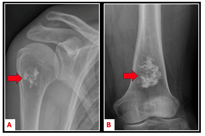 Figure 1. Anterior-posterior (AP) imaging of an enchondroma in the proximal humerus (A) and in the distal femur (B).